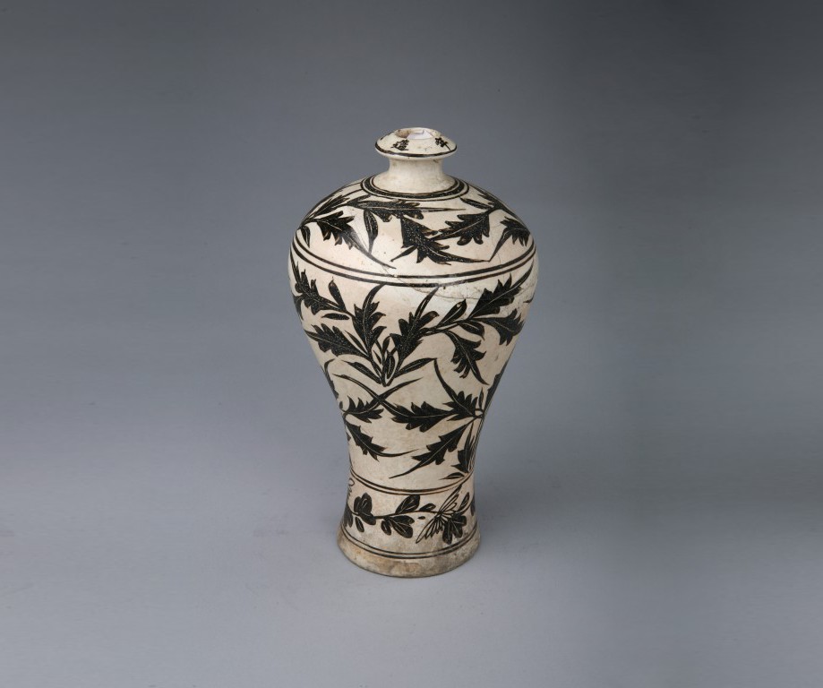 说明:1983年李初梨捐赠。小口,宽斜沿出楞,短颈,丰肩,斜直腹,近底处外撇,凹圈足,底无釉。弦纹把器身分隔成四个区:口沿自右向左署黑彩五字款“大定二年造”;肩和腹部绘一周折枝卷草纹;下腹绘缠枝菊花纹。整体纹饰布局合理,线条简练奔放,图案生动活泼。胎体厚重,质地紧密,白釉底,黑彩彩绘,色彩对比强烈,富有浓郁的民间生活气息。