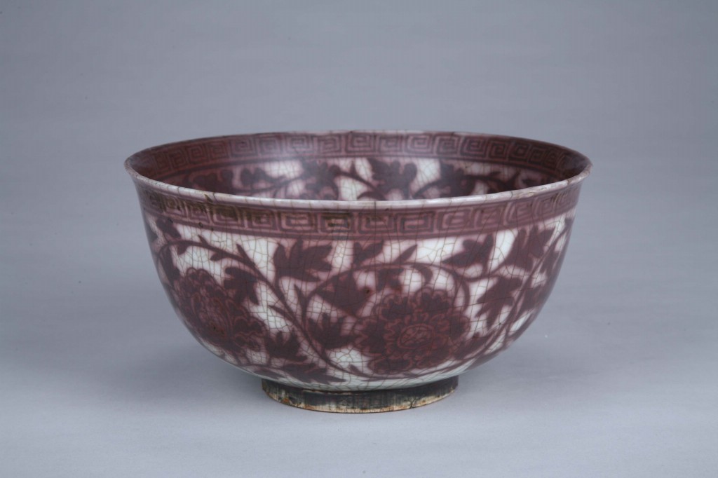 说明:1951年申彦丞捐赠。敞口,深鼓腹,圈足。口沿内外绘回纹,内壁绘缠枝菊花纹,底双圈内绘折枝牡丹纹;外壁绘缠枝牡丹纹,圈足外墙绘回纹。器身满施釉里红,釉色红中泛黑,通体开片。无款识。