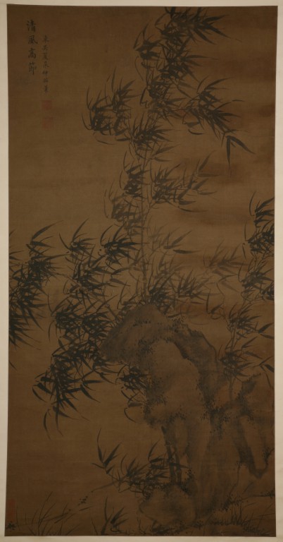 此图为水墨大中堂,写山石墨竹。图中墨竹因风飘举、摇曳多姿。近竹用浓墨以楷书笔法描绘出鲜活之态,远竹和竹竿用淡墨轻染,制造层次分明之感。山石以斧劈皴淡墨少勾,浓墨点苔。叶分向背,墨化五色。作者自题“清风高洁”。