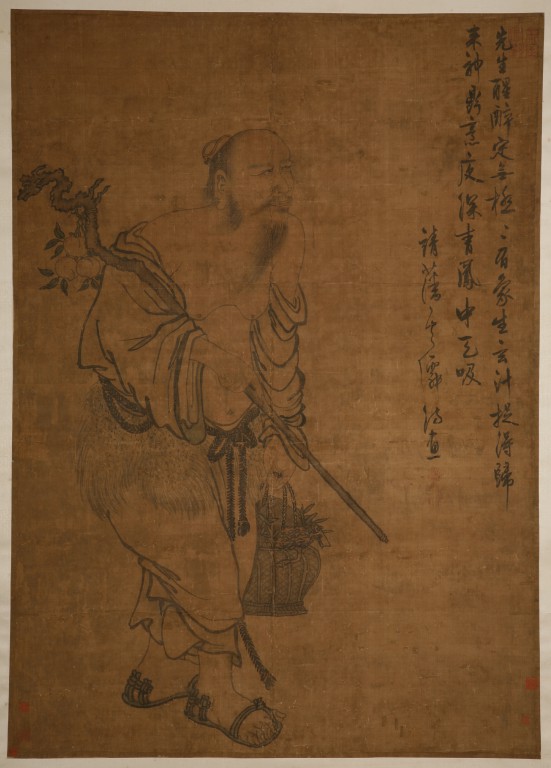 画面中一仙人携杖提篮,似采药归来,坦腹跣足,神色潇洒不羁。人物以墨笔勾染,仅药草仙桃略施彩色,使整幅画显得淡雅古朴。