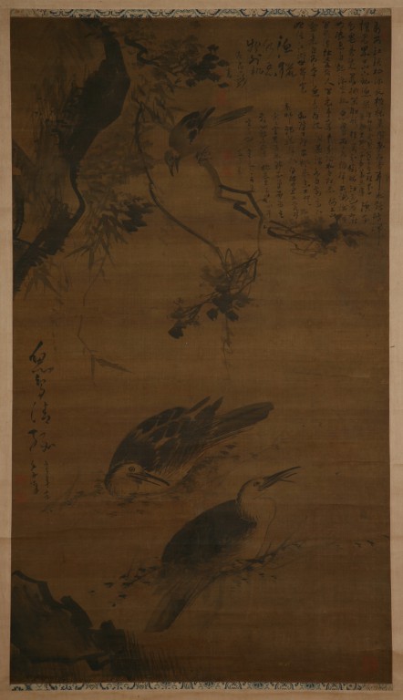 图中水鸟二只游戏水中,左上山岩上垂下的树枝上一小鸟正探身下视。整幅画面运笔豪放,挥洒自如,墨色活润之中见笔势之飞动。原画本无款,经清人高凤翰鉴定为林良作品,并题绝句四首及图名“鱼鸟清缘”。