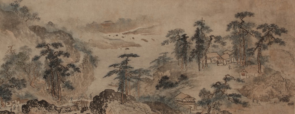 本卷设色绘江南景色。林木闾舍,桥板蹊径,湖港纵横,山势绵延,水汽蒸腾,人物舟船点缀其间,生气盎然。用笔苍劲古雅,设色浓淡合度,使人见之忘俗。题款为人割裂,从其画风上看,当为明代中期浙派作品。