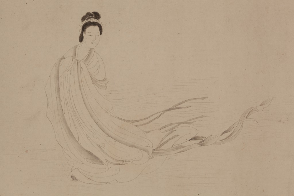白描洛神凌波冉冉而行,衣裙迎风飘举,回首含睇之态。作品为丁云鹏的典型风格。从前后收藏鉴赏印考察,知为高士奇、朱之赤等名家收藏。前后题字者共计十九人。