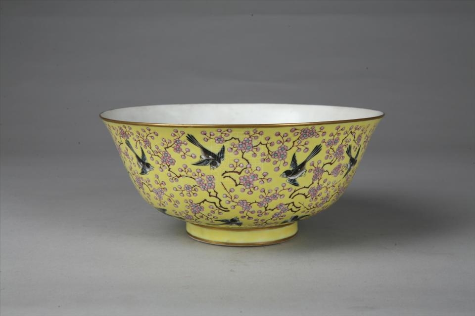 清同治年制款黄地粉彩梅鹊纹瓷碗