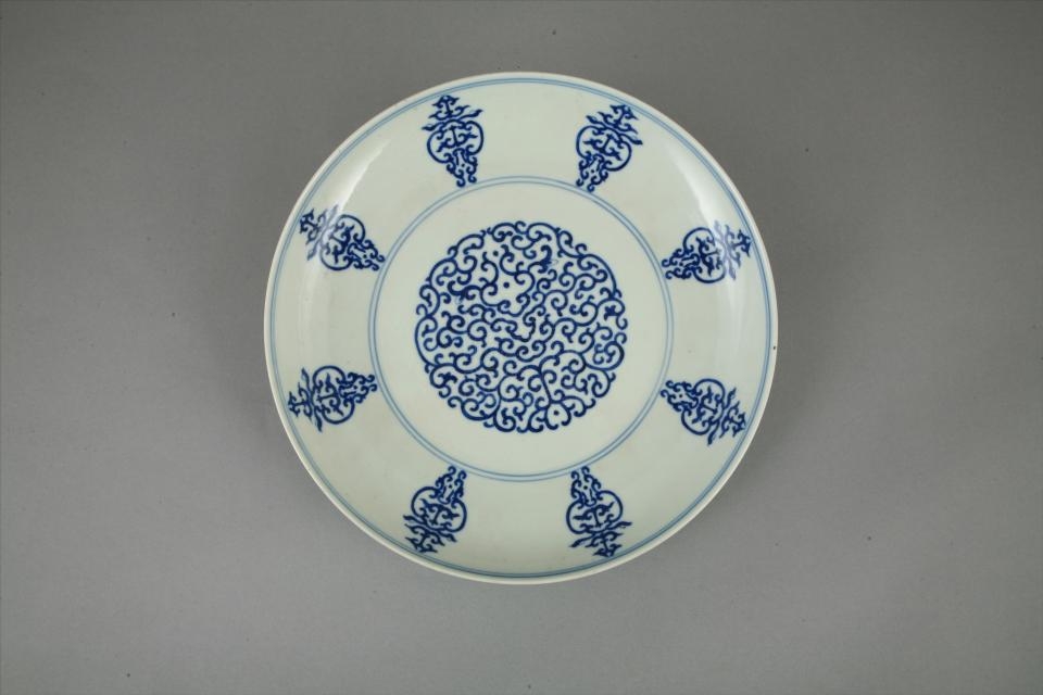 清道光款青花勾云团寿字纹瓷盘