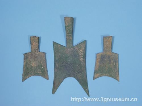 第一单元 古代钱币 商周贝币 夏商时期,一种产自东南沿海的小贝壳,作为一种具有财富意义的装饰品,在原始的物物交换中率先演变成为中国最早的货币。其后又出现各式仿贝币,如骨贝、铜贝、鎏金铜贝等。商代铜器铭刻中的荷贝行船图,描绘了商人们肩挑背扛大量贝币进行商贸活动的景象。 布币 布币,系由古代一种青铜铲形农具演变而来。西周中后期,中原重要农业区率先完成实用农具向货币形态的转化。春秋战国时期的布币,种类规格繁多,流通地域广大,早期的大型空首布,尚保留有古农具用以插木柄的方孔,以后渐向轻薄型方向发展。布币