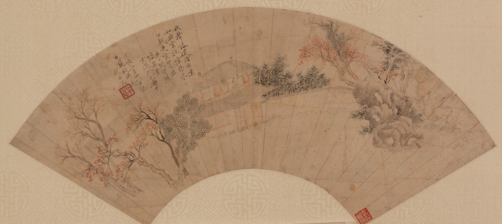 时代:清 尺寸:纸本设色 纵17厘米,横52厘米 说明:1951年王缵绪捐献。 钱杜(1764-1845年)字叔美,号松壶,又号壶公,卍居士。浙江钱塘人。好游,足迹遍天下。山水宗文徵明,作细笔,风格秀雅。花卉近恽寿平,兼工人物。 此图描绘庭院之景,山石丛篁、杂树红叶、矮墙迤逦,中有楼阁,阁上一人倚栏而望。用笔纤细秀致,设色精雅,得文衡山遗韵。 款识:“秋声落遥渚,木叶如黄云。旌幢纷来下,疑是云中君。楚楚阁望隔墙黄叶,云溪外史寿平。 丁亥三月廿八日为少兰戏临一过,钱叔美”。 钤印:“松壶小隐”朱文