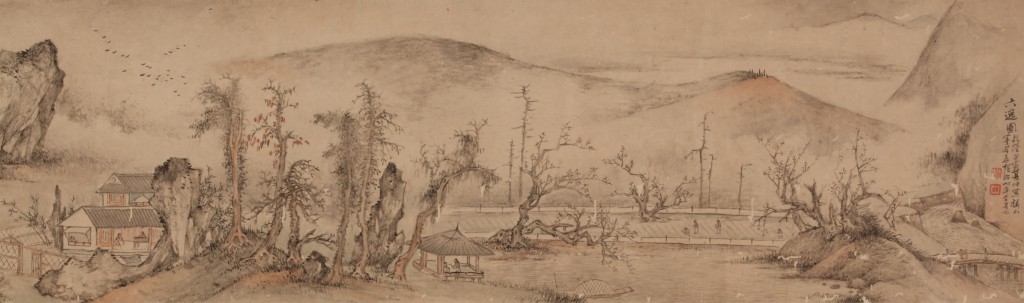 时代:清 尺寸:纸本设色 纵111厘米,横23.5厘米 说明:1951年王缵绪捐献。 张洽(1718-?)字月川,一作玉川,号圆光道士,又号青篛古渔。吴县人。张宗苍族子。擅山水,得张宗苍法。 此卷描绘江丽田、韩学元、卞立言、薛松岩、薛升农及作者六人于乾隆甲寅年(1794年)在水筠庄为诗酒会,或投壶垂钓,或赋诗作画的文人雅集。山石以干笔淡墨皴擦而出,画风苍劲,用笔沉着。 款识:“六逸图。乾隆甲寅夏仲写摄山寄安居,张洽时年七十有七”。 钤印:白文“张洽”、朱文“玉川”印。