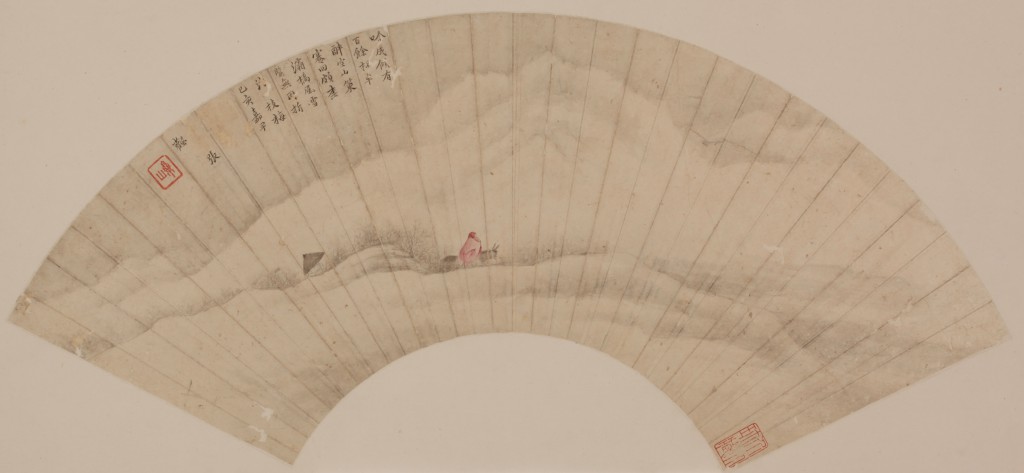 时代:明 尺寸:纸本设色 纵16.5厘米,横52厘米 说明:1951年申彦丞捐献。 张风,上元人,字大风,号升州道士,又号上元老人。崇祯诸生,善画,不特山水称妙,人物、花草亦恬静简适。 此图于蜡光笺上以水墨写景,人物淡设色。描绘苍茫风雪中一老者策驴而行的情景。作者只勾不皴,以淡墨染出浅浅山石轮廓。而一片白茫茫之中,一点红色的斗篷恰似画龙点睛,使整个画面霎时鲜活生动了起来,尤显出天地之苍茫。真乃笔墨中之散仙。 款识:“吟成倾有百余杯,半醉雪山策蹇回。颇奈灞桥风雪紧,无因折得一枝梅。乙亥嘉平,张风”
