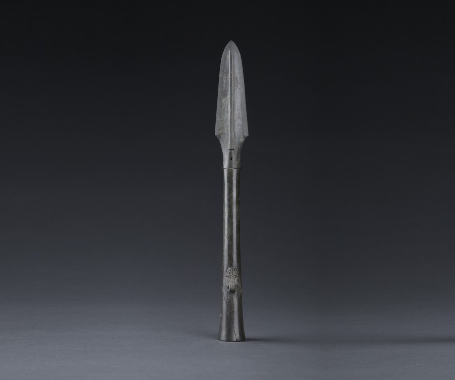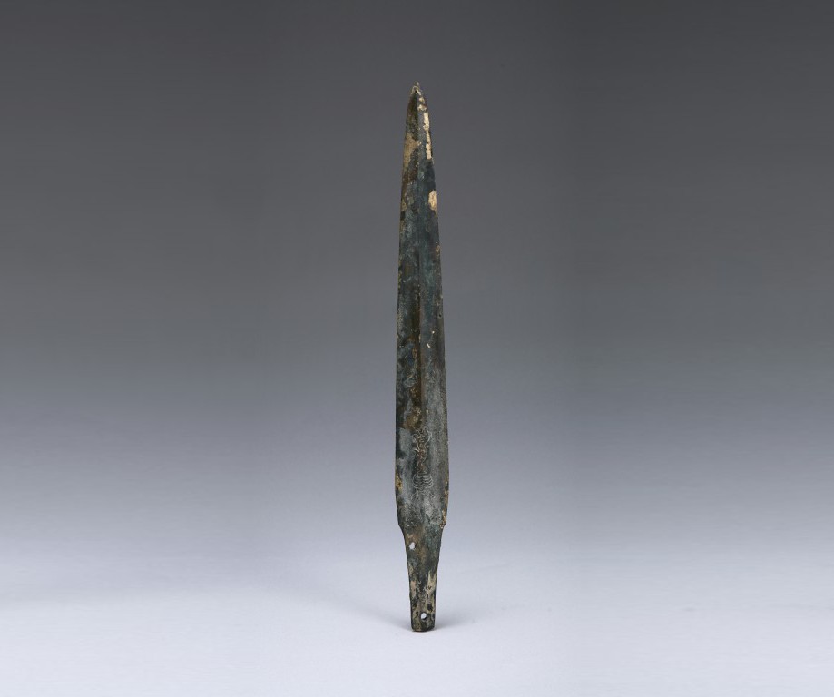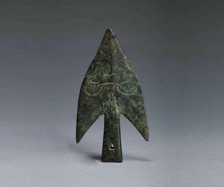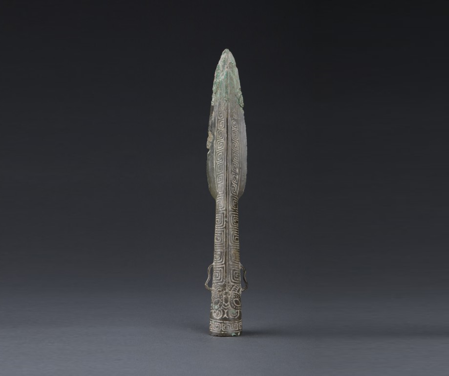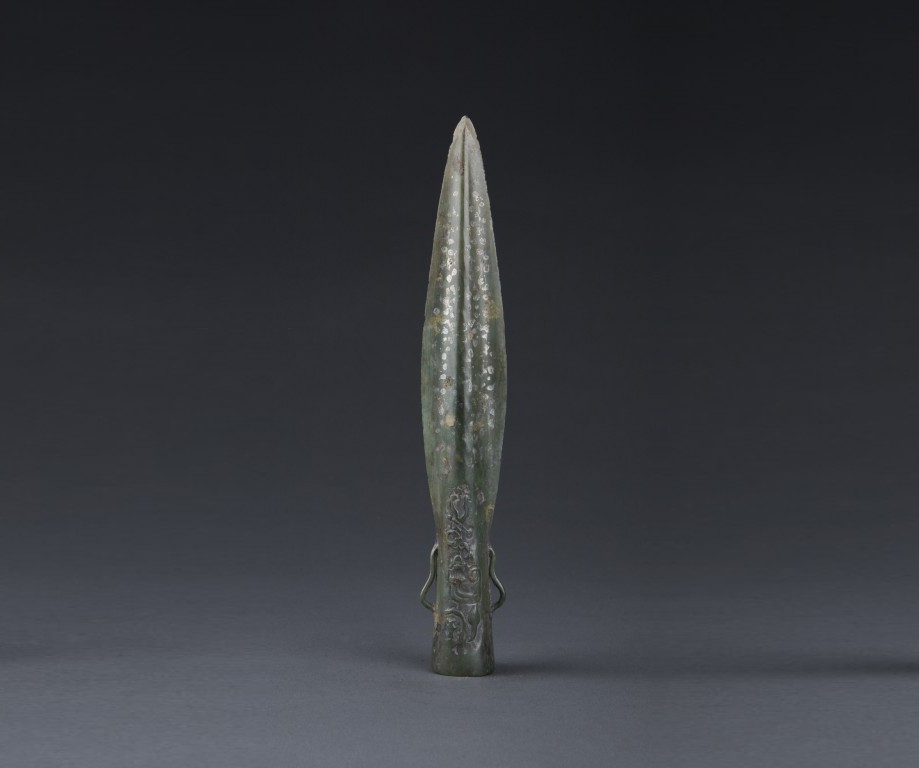 时代:战国 尺寸:长21厘米 说明:重庆云阳李家坝出土。青铜兵器,一锋二刃,中为隆起的脊。骹上饰手心纹,蛇头纹及武士配剑像,两侧有上小下大的弓形系。
