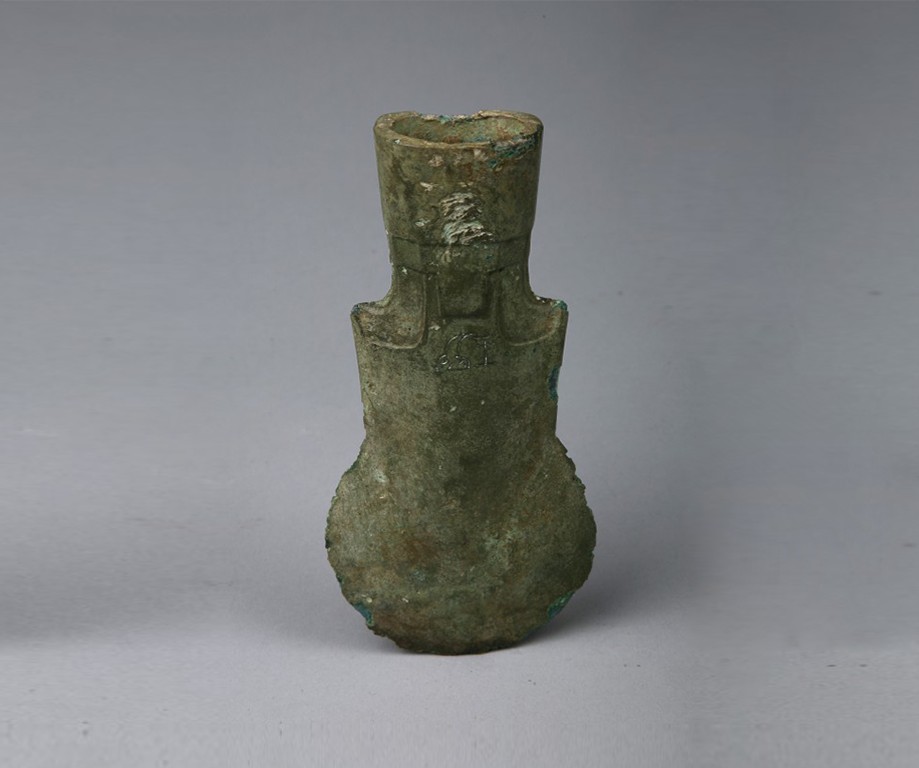 时代:战国 尺寸:长16.2厘米,宽7.6厘米 说明:重庆巴县冬笋坝出土。青铜兵器,圆刃,刃边缘微缺,折腰,椭圆形銎。钺身铭文为“王”字。