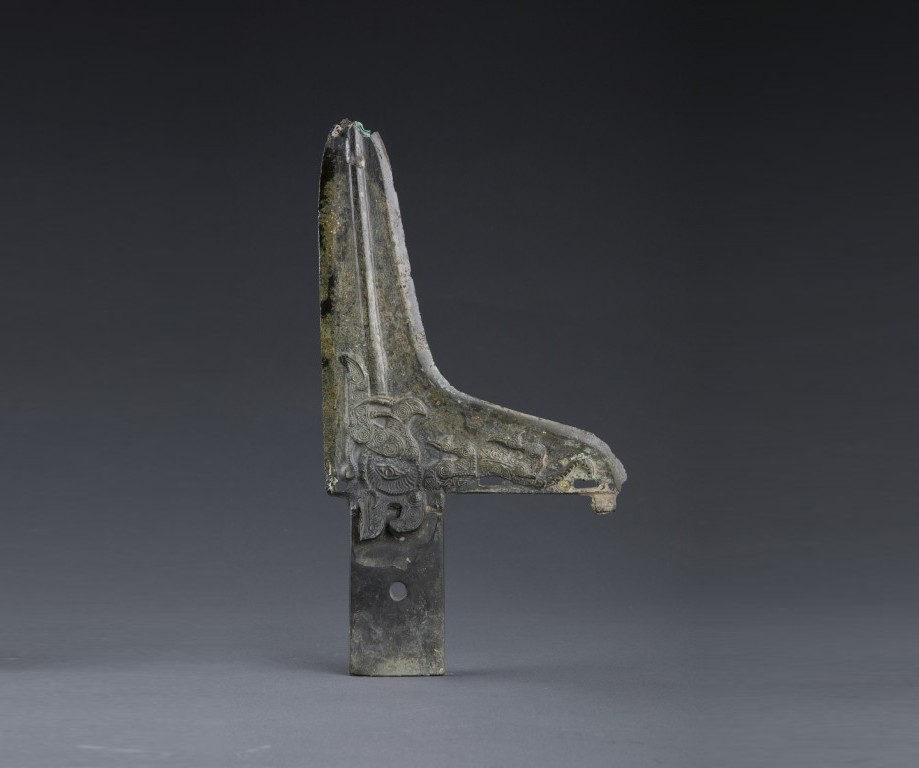 时代:战国 尺寸:长25.6厘米,宽13.6厘米 说明:重庆云阳李家坝出土。青铜钩击兵器。直援,方内,内有一穿,长胡三穿。两面各有浮雕状的虎头,虎耳向后伸至內上,张口瞪目,口含一条鱼,状极狰狞。虎身延至胡部,尾上翘,呈奔走状。援脊有一行巴蜀符号。