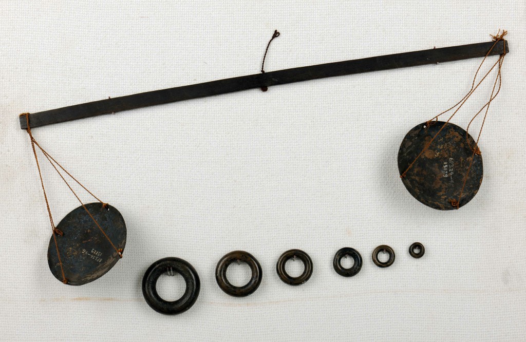 时代:战国 尺寸:长14.2厘米 说明:由衡,戥子及环三部分组成。衡为木质小木条,长14.2厘米;戥子为铜制小圆盘,直径7.6厘米;环为系列铜环(砝码),共六枚,最小直径1.3厘米,重五铢,其余重量依次加倍,至最大直径4.9cm,重一百六十铢。铭文“之官环”在第三环。