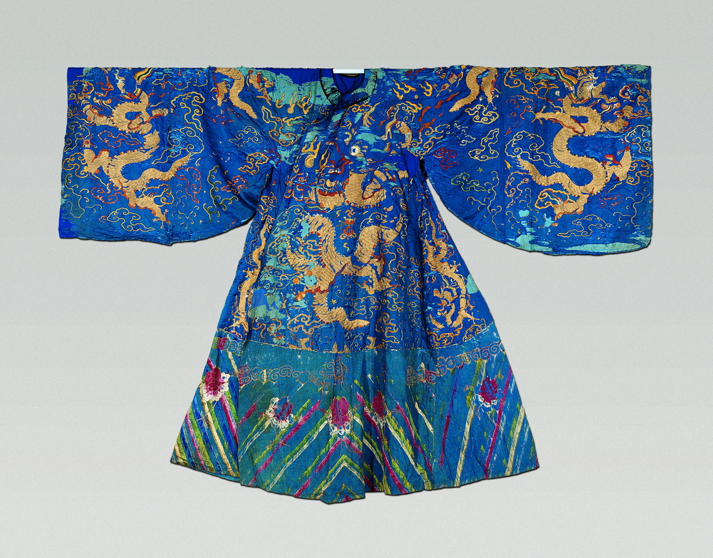 衣长171厘米, 袖长127.5厘米。 蓝缎地,盘金绣,圆领右衽,大袖。 前胸、后背各绣一立蟒;前后幅左右两襟各绣一蟒;两袖正反面各绣一蟒。蟒纹间彩绣万福、如意、云纹等纹饰。